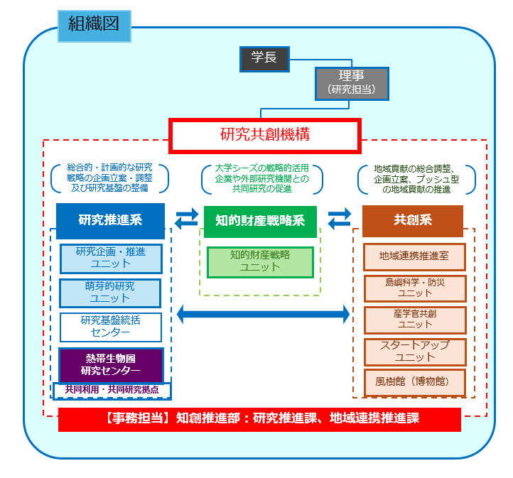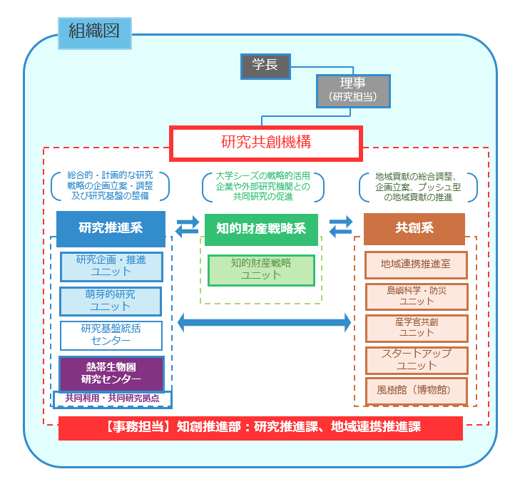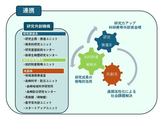 本学ではこれらの課題に戦略的かつ横断的に取り組むべく、研究推進機構と地域連携推進機構を再編し、研究推進・知的財産戦略・地域共創の3つの柱を統合した新たな組織を設立しました。